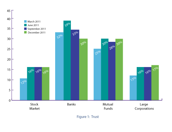ABOUT THE SURVEY: On a quarterly basis, the Financial Trust Index captures the amount of trust that Americans have in the institutions in which they can invest their money. The survey is conducted by Social Science Research Solutions (SSRS) using ICR/International Communications Research’s weekly telephone poll service. As part of the most recent wave, a total of 1,050 individuals were surveyed from Dec. 14 to Dec. 20, 2011. The institutions considered in the survey are banks, the stock market, mutual funds, and large corporations.