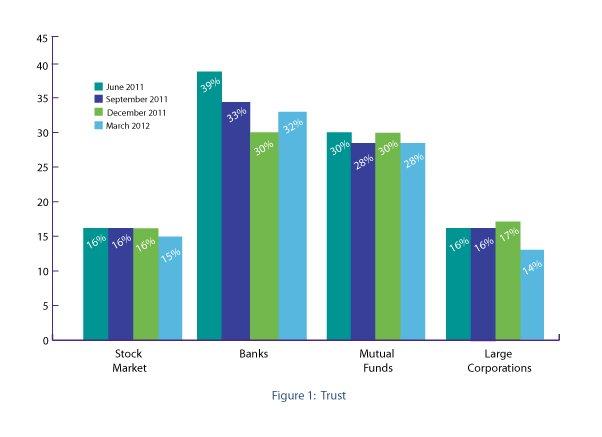 Trust in the stock market, mutual funds and large corporations all dwindled slightly in this survey, but trust in banks rose by two percentage points to 32 percent.