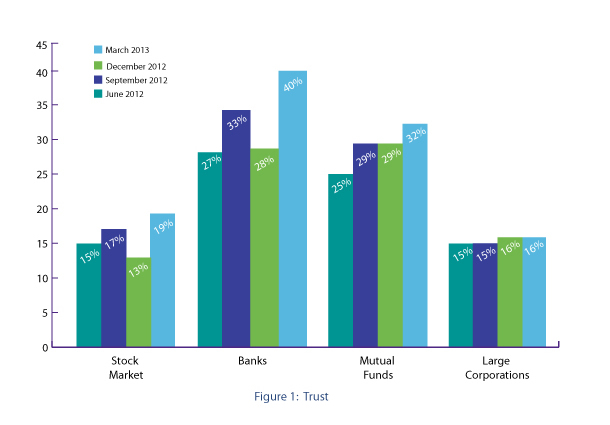 ABOUT THE SURVEY: On a quarterly basis, the Financial Trust Index captures the amount of trust that Americans have in the institutions in which they can invest their money. The survey is conducted by Social Science Research Solutions (SSRS) as part of their weekly national telephone survey, EXCEL. In the most recent wave, a total of 1,012 individuals were surveyed by live interviewers (not IVR) March 20 to March 27, 2013. The institutions considered in the survey are banks, the stock market, mututal funds and large corporations. |